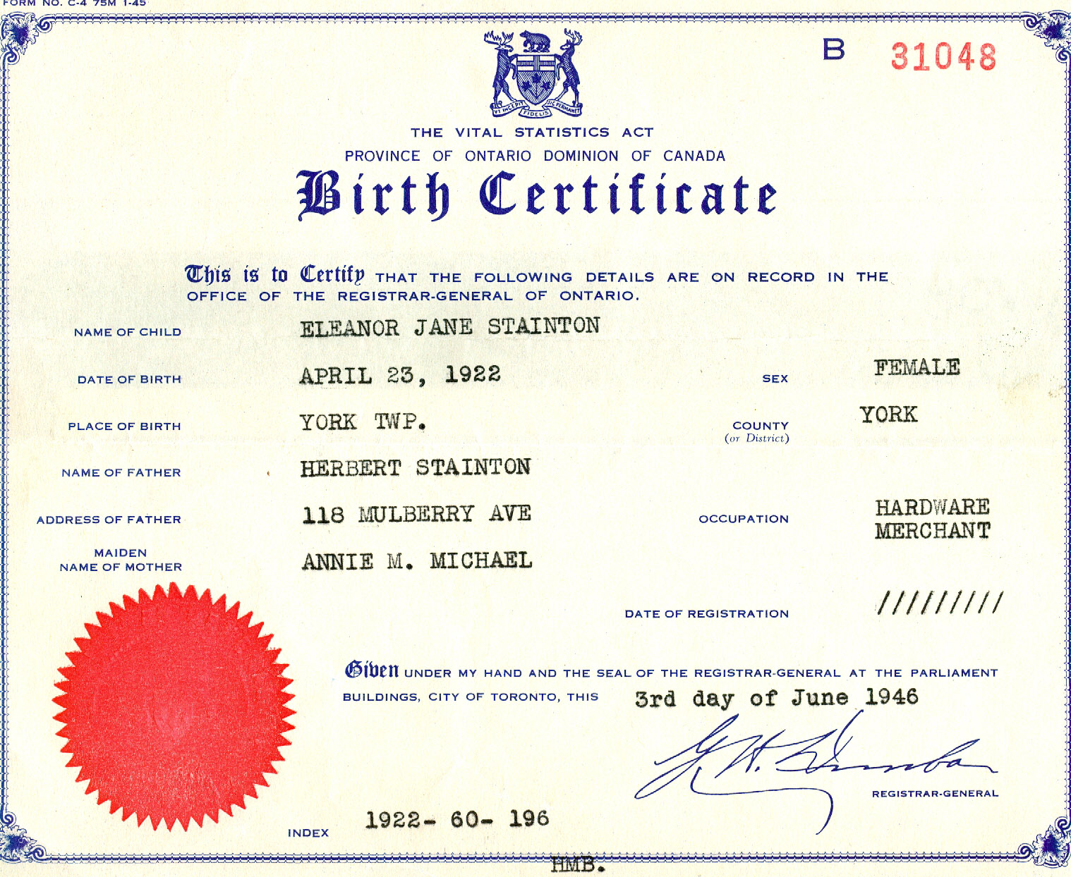 10 August 1880, Darlington Township, Ontario. Would live 103 years.
