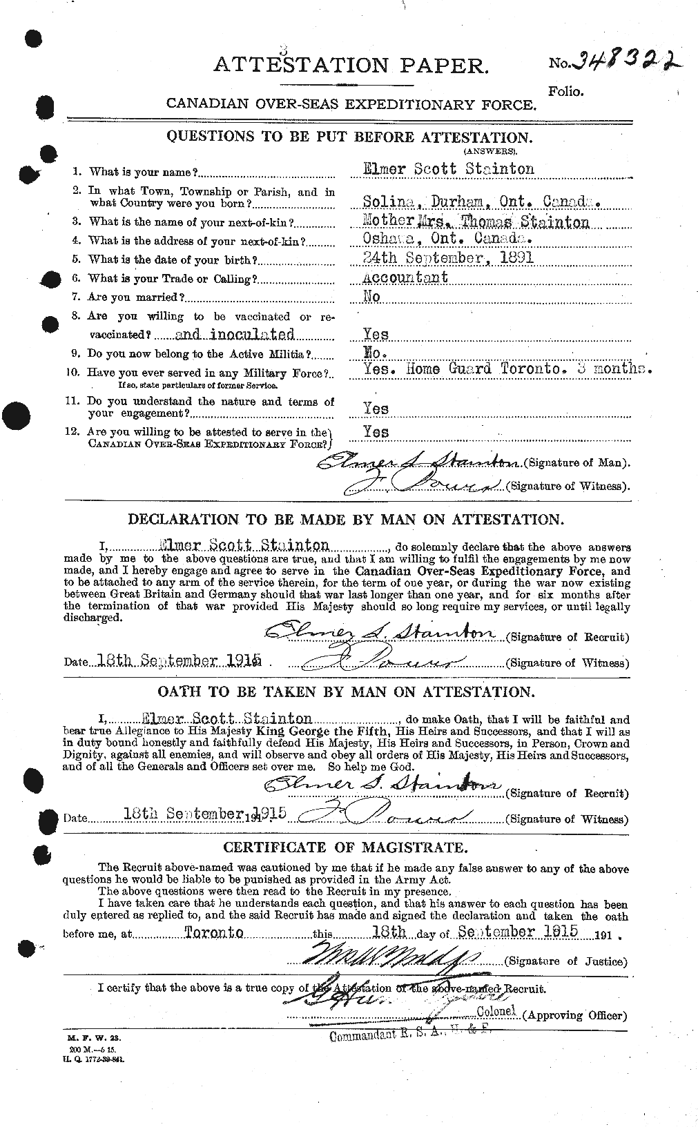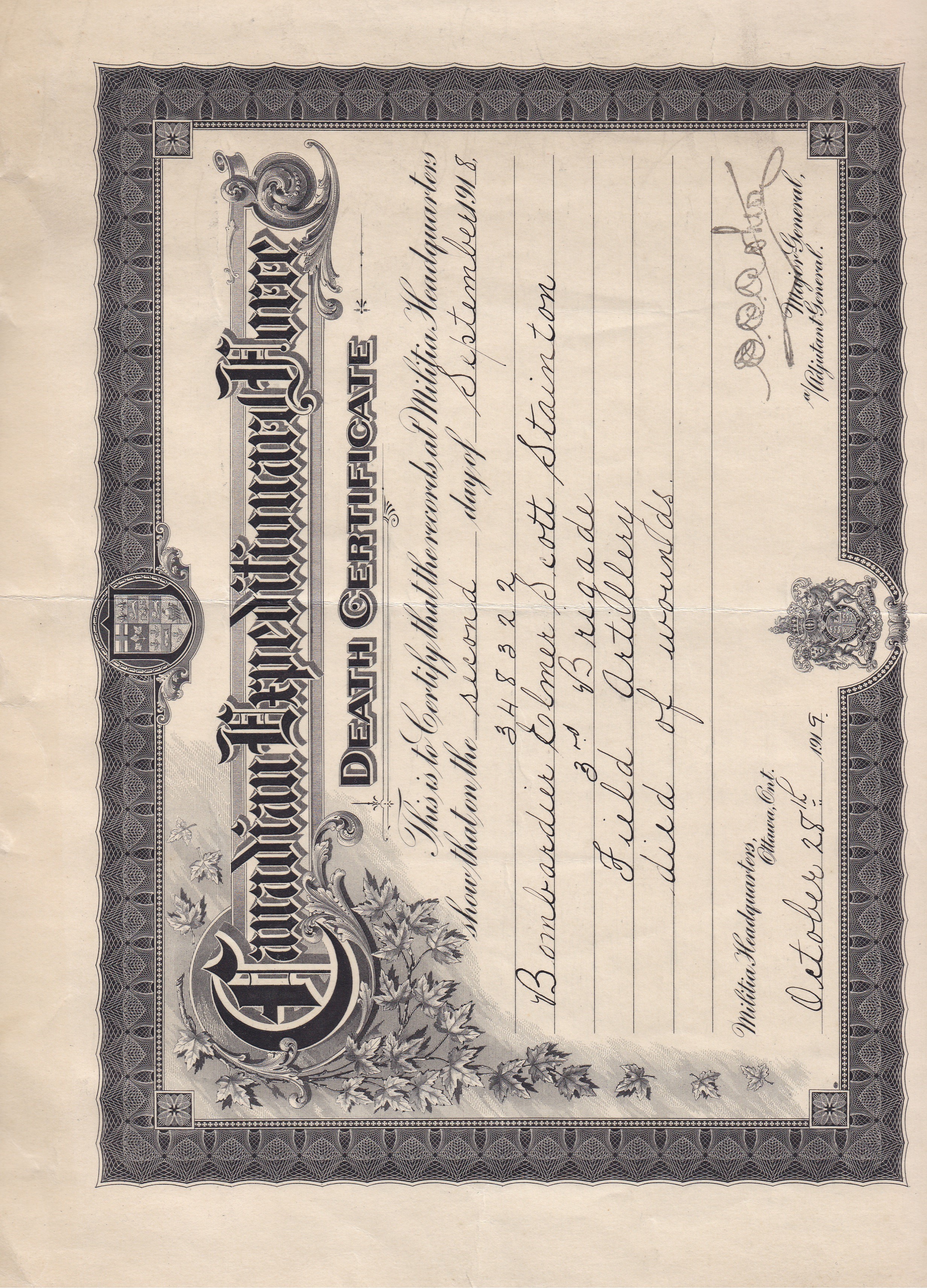 "His brother Elmer Scott died on September 2, 1918, when Herbert was 38 years old. Elmer Scott Stainton 1891–1918, France/Belgium."